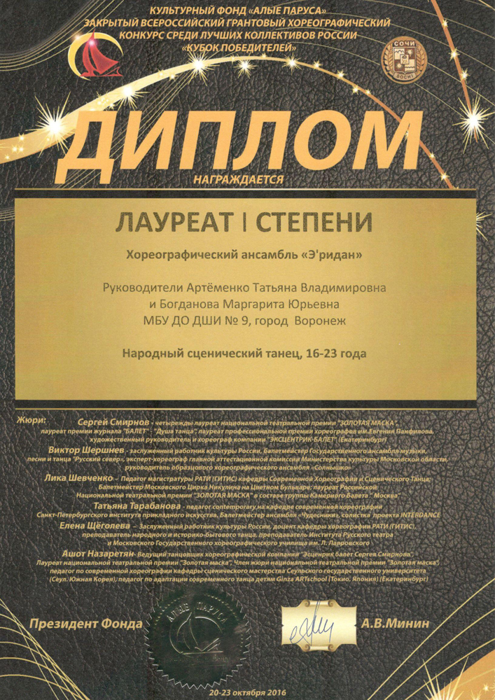 С 20 по 23 октября в Сочи проходил Закрытый Всероссийский грантовый хореографический конкурс среди лучших коллективов России «Кубок победителей», в котором получили право участвовать 42 коллектива - победителя Всероссийских конкурсов культурного фонда «Алые паруса» 2015 года. В их число вошел коллектив ДШИ № 9 «Э’ридан» - лауреат первой степени Первого Федерального хореографического конкурса «Московская осень».