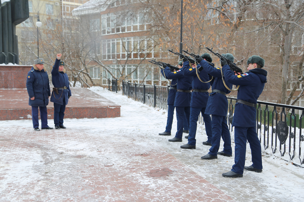 После чего военный оркестр исполнил гимн Российской Федерации, прозвучали оружейные залпы, и по площади Победы торжественным маршем прошли курсанты роты Почетного караула Военно-воздушной академии имени Жуковского и Гагарина.