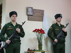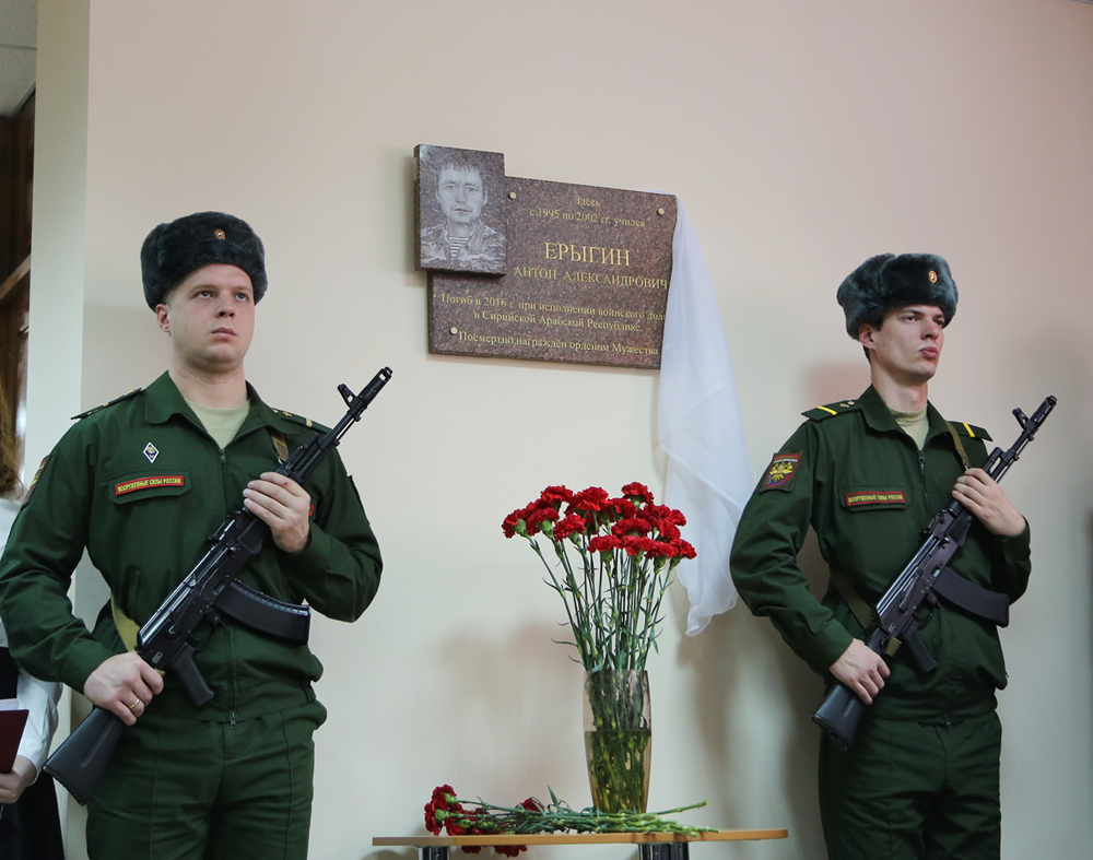 Мемориальная доска погибшему в Сирии при исполнении служебного долга сержанту Антону Ерыгину была открыта 9 декабря в фойе лицея № 8 (ул. Генерала Лизюкова, д. 52) , в котором учился Ерыгин.