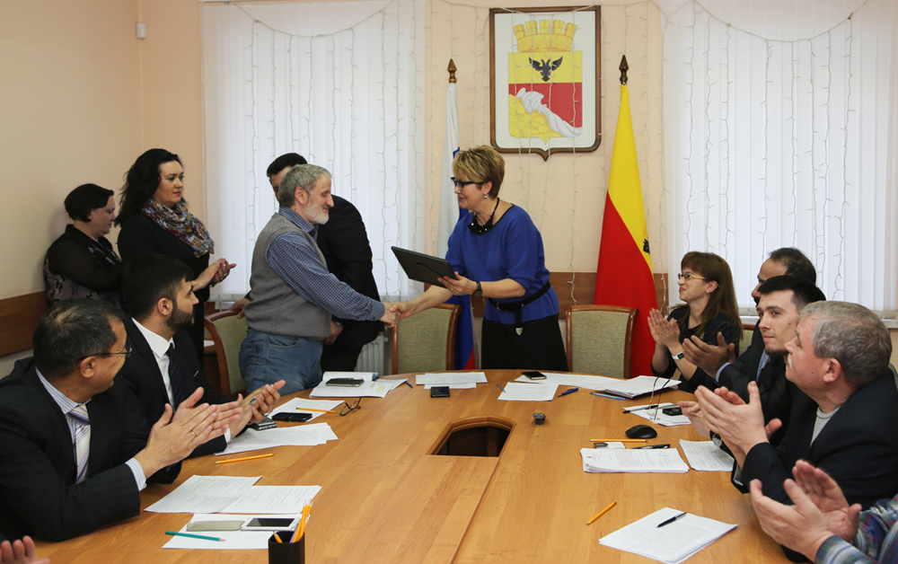 Руководитель управления по работе с административными органами и структурами горадминистрации Елена Гудкова по поручению главы города Александра Гусева вручила благодарность главы за участие в работе по обеспечению межнационального и межконфессионального согласия на территории города Воронежа и укрепление гражданского единства и гармонизации межнациональных отношений руководителю местной религиозной организации мусульман «Свет» города Воронежа Юсупу Абдулаеву грамоту за активное участие в работе межнационального и межконфессионального согласия на территории Воронежа.