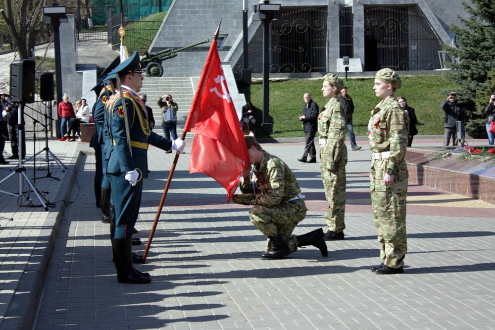Здесь, у братской могилы стяг из рук курсантов Воронежского института государственной противопожарной службы приняли ученики 13-й школы. До 5 мая копия штурмового знамени 150-й Идрицкой стрелковой дивизии, взвившегося над Рейхстагом в 1945-м, будет путешествовать по всем школам Ленинского района. В каждом учебном заведении пройдут вахты памяти, а в преддверии Дня Победы флаг вернется к будущим спасателям.