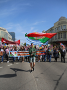 Под звуки губернаторского оркестра и громогласное «Ура!» демонстранты с флагами, транспарантами, цветами и воздушными шарами прошли от здания ЮВЖД до Никитинской площади.
