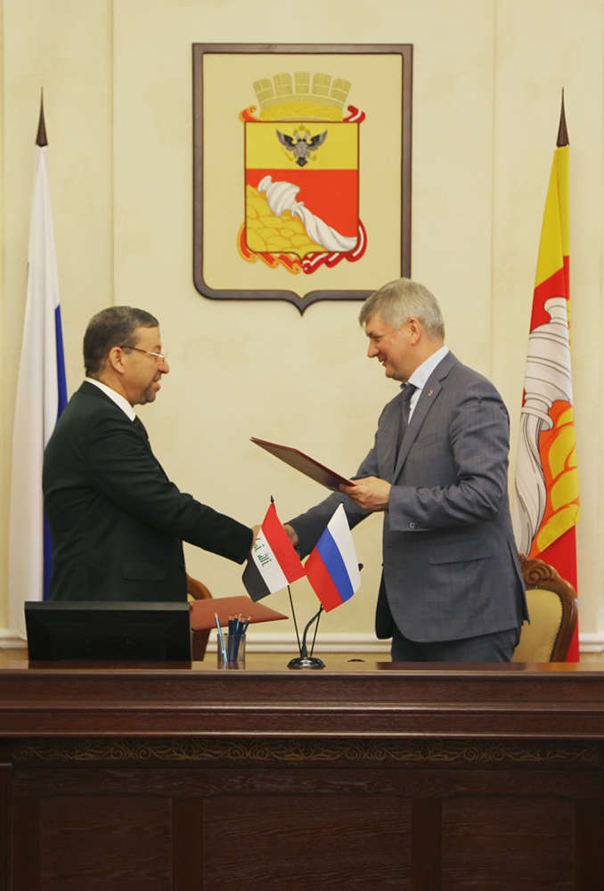 По итогам встречи председателем Муниципального совета города Балад Аббасом Фадхилом Джаафаром и мэром Воронежа Александром Гусевым был подписан Протокол о намерениях по развитию дружбы и сотрудничества между городами.