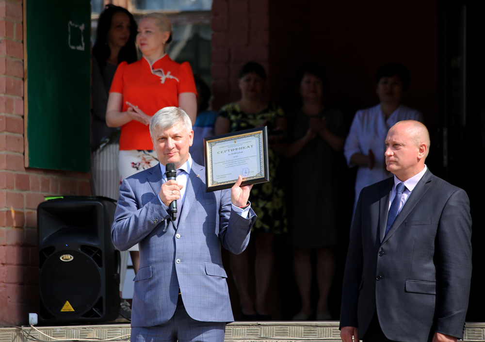 Глава Воронежа передал директору школы Сергею Горлову сертификат на 100 тысяч рублей, а также сообщил всем участникам торжественной линейки, что в ближайшее время будет разработан проект пристройки к учреждению, а уже в следующем году на месте рядом стоящего разрушенного здания начнутся строительные работы.