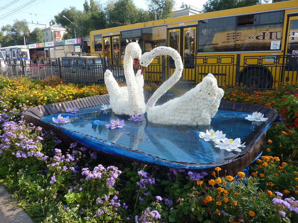 В Коминтерновском районе на газонной части перед ярмаркой «Клинической» установили великолепную цветочную композицию под поэтичным названием «Лебединая песня».