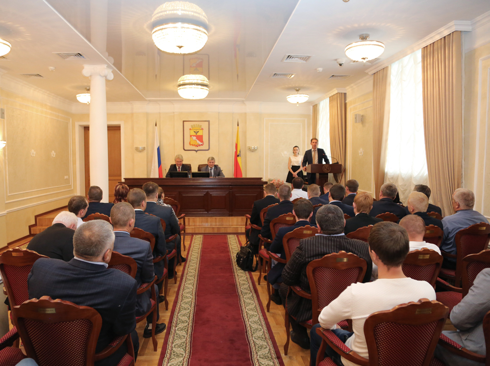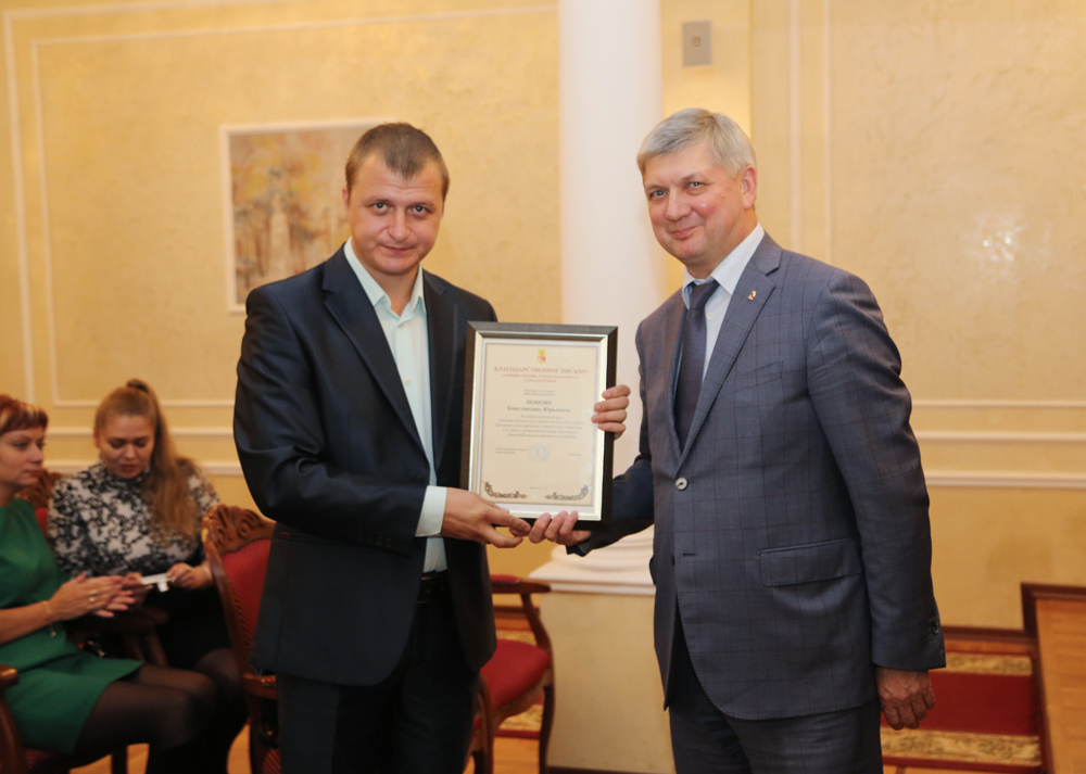 Торжественная церемония награждения с участием главы города Александра Гусева и председателя Воронежской городской Думы Владимира Ходырева и исполняющего обязанности руководителя управления дорожного хозяйства Олега Котова прошла в большом зале мэрии.