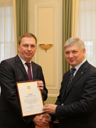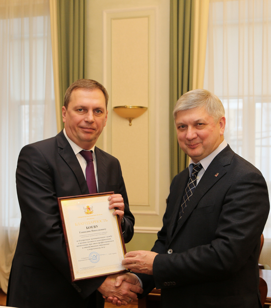 По поручению губернатора Воронежской области Алексея Гордеева мэр города Александр Гусев вручил руководителю контрольно-аналитического управления Геннадию Боеву благодарность губернатора «За безупречную муниципальную службу в органах местного самоуправления, проявленные при этом профессионализм и ответственное отношение к порученному делу».