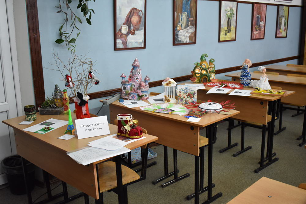 В одной из аудиторий МБОУ СОШ № 12 развернута выставка различных поделок, материалом для которых стали предметы быта, отслужившие свой век.