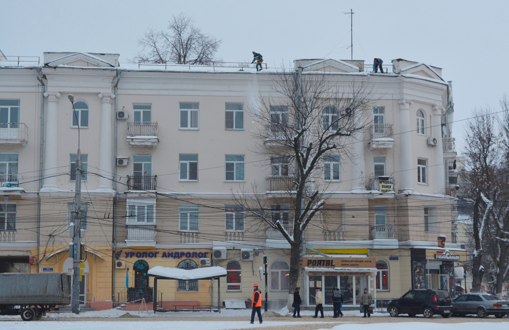 В районах Воронежа продолжается работа по очистке кровель от снега и наледи