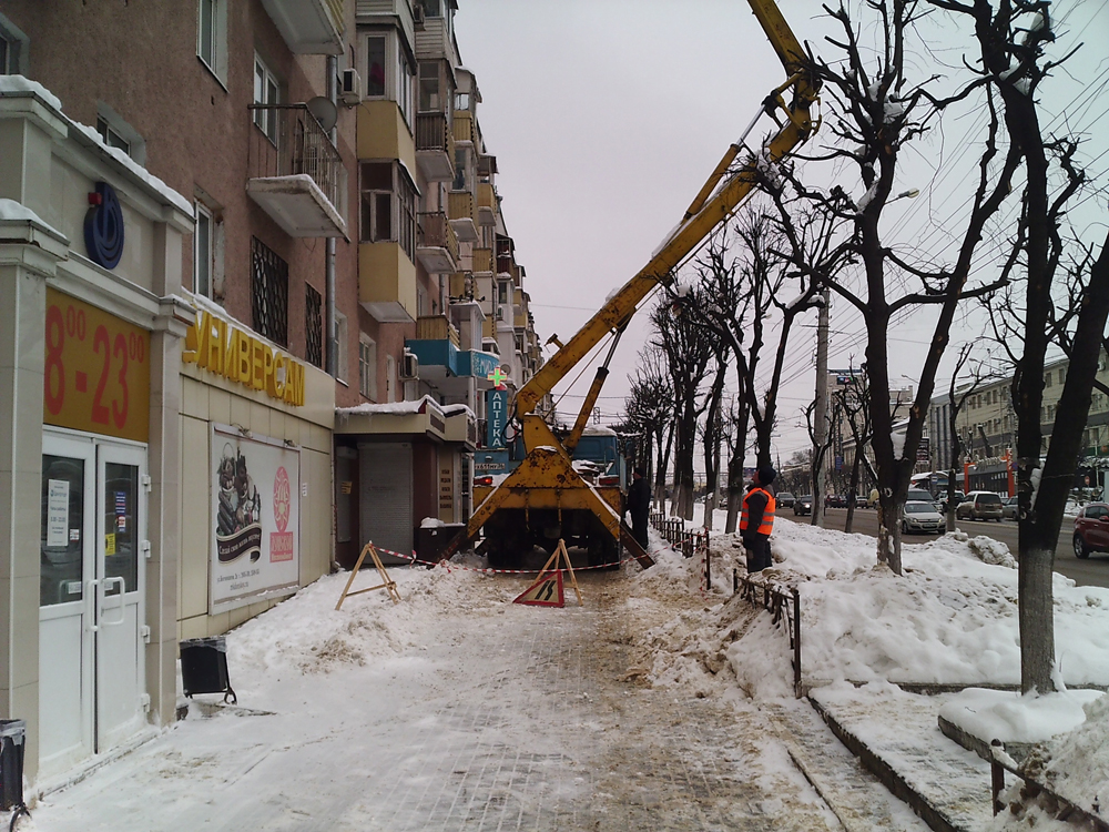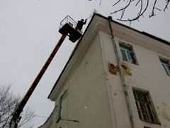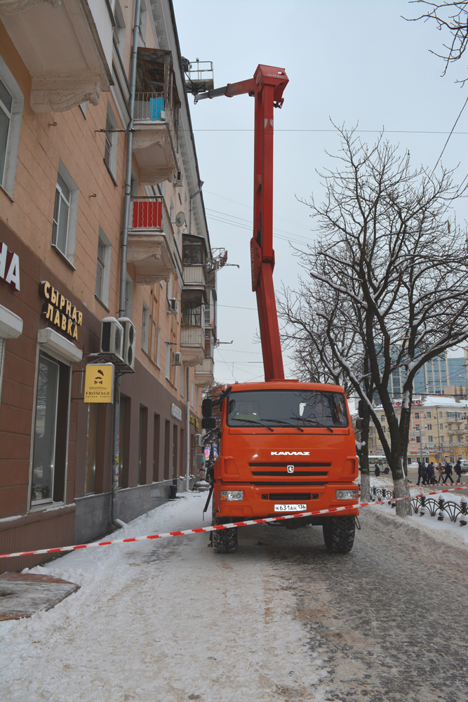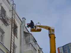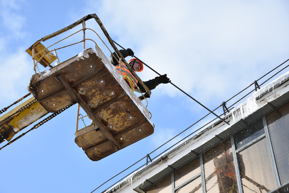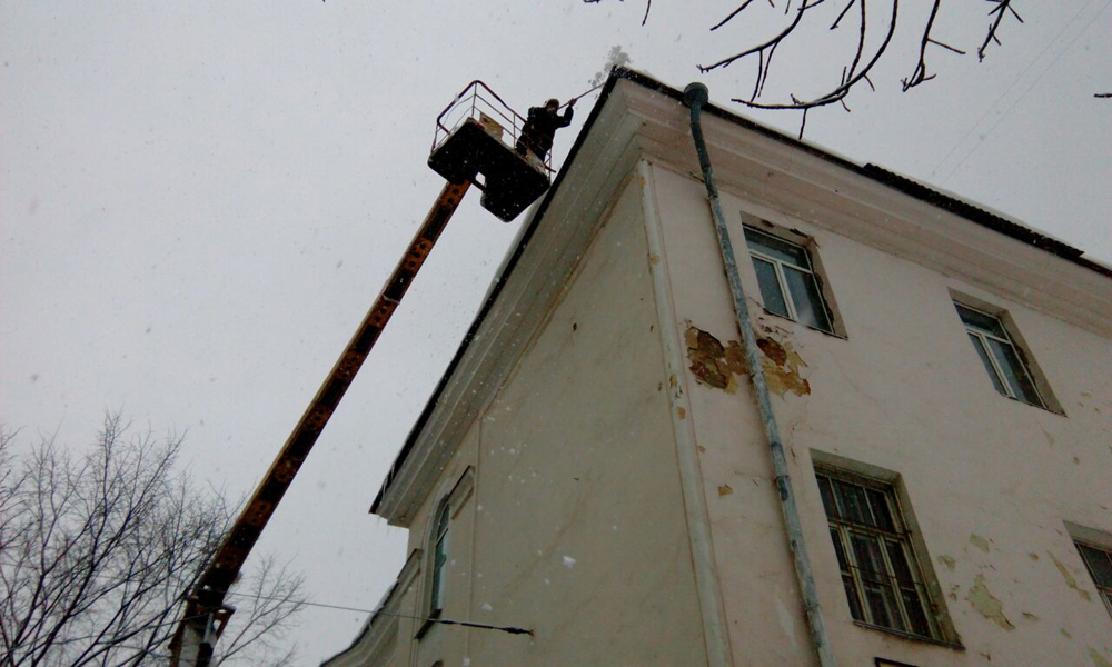 Сегодня, 31 января, работа проводилась с привлечением 6 автовышек. В первую очередь, выполняется очистка кровель в местах массовой проходимости людей.