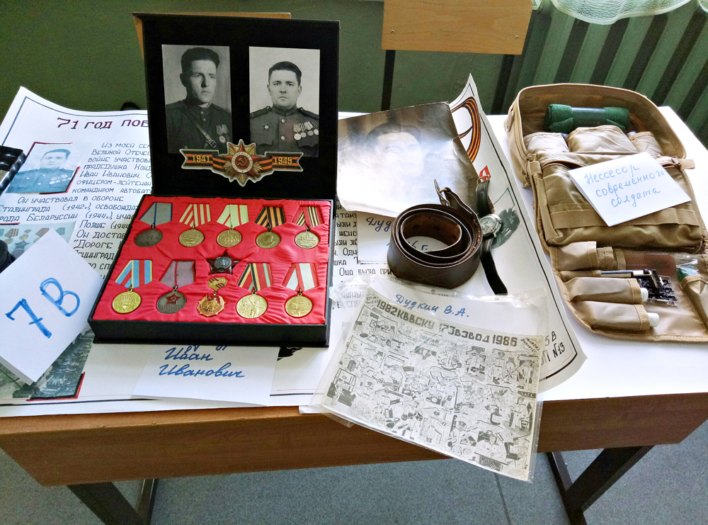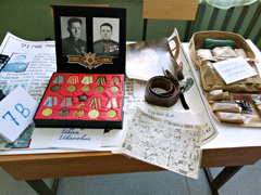 Чего только не было: грамоты и благодарности, шинели, кители, маскхалат, фуфайка времен Великой Отечественной войны, шлем танкиста, вырезки из газет, медали и ордена, фотографии, фуражки, пилотки, планшеты....