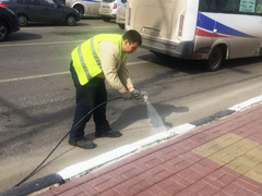 В пятницу, 6 апреля, в центральной части района рабочие осуществляют покраску бордюров с использованием окрасочного аппарата высокого давления АВД 7000.