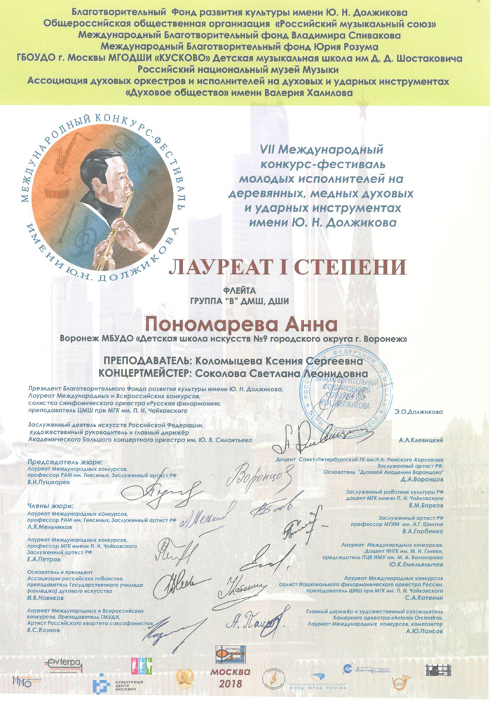 Анна Пономарева (преподаватель Ксения Коломыцева, концертмейстер Светлана Соколова) получила диплом лауреата 1 степени, Анастасия Филиппова (преподаватель Анна Щетко, концертмейстер Наталия Бабик) стала обладателем диплома лауреата 2 степени.