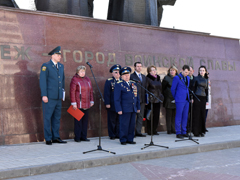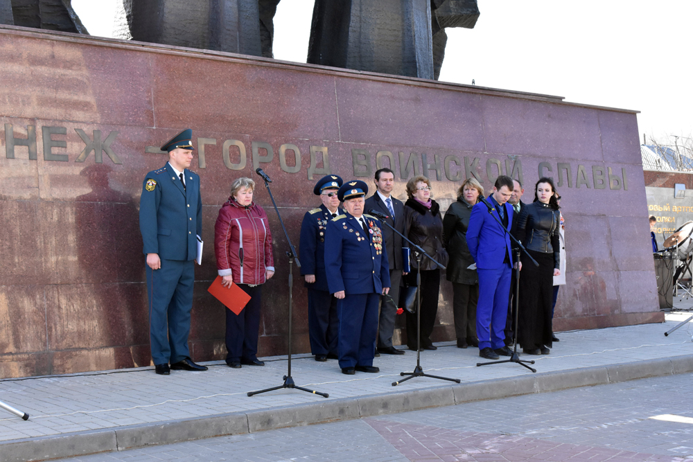 У братской могилы стяг из рук курсантов Воронежского института - филиала Ивановской пожарно-спасательной академии ГПС МЧС России приняли ученики 13-й школы. До 8 мая копия штурмового знамени 150-й Идрицкой стрелковой дивизии, взвившегося над Рейхстагом в 1945-м, будет путешествовать по всем школам Ленинского района. В каждом учебном заведении пройдут вахты памяти, а в преддверии Дня Победы флаг вернется к будущим спасателям.