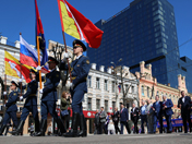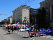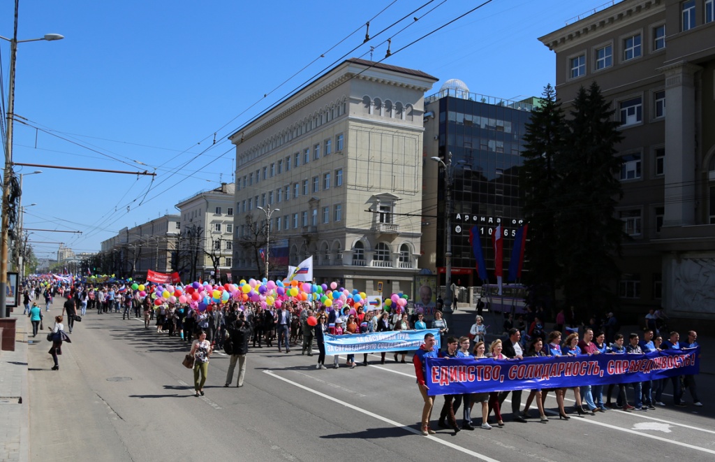 На праздник весны и труда жители города вышли на традиционно организованную профсоюзами первомайскую демонстрацию.Около 25 тысяч воронежцев – представители трудовых коллективов учреждений образования, здравоохранения, спорта, культуры, промышленности, бизнеса, студенты вузов и ссузов – под громогласное «Ура!» и звуки губернаторского оркестра прошли по проспекту Революции от здания ЮВЖД до Никитинской площади.