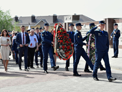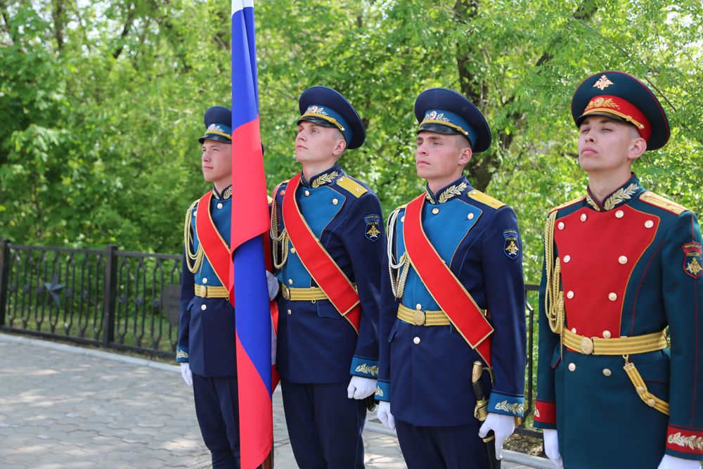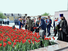 Отдавая воинские почести героям войны, Почетный караул прошел торжественным маршем под звуки «Прощания славянки» и залпов оружейного салюта.