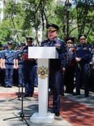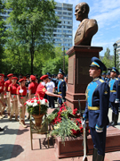 Под звуки гимна Российской Федерации, исполненного военным оркестром, и оружейные залпы курсанты роты Почетного караула сняли покрывало, и бюст предстал перед глазами участников церемонии. Все желающие смогли возложить венки и цветы к памятнику.