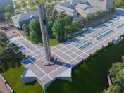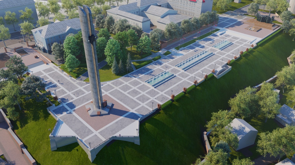 На оси между стелой и скульптурной группой планируется убрать газоны и на их месте сделать группу каскадных фонтанов в два ряда (с вечерней и ночной подсветкой).