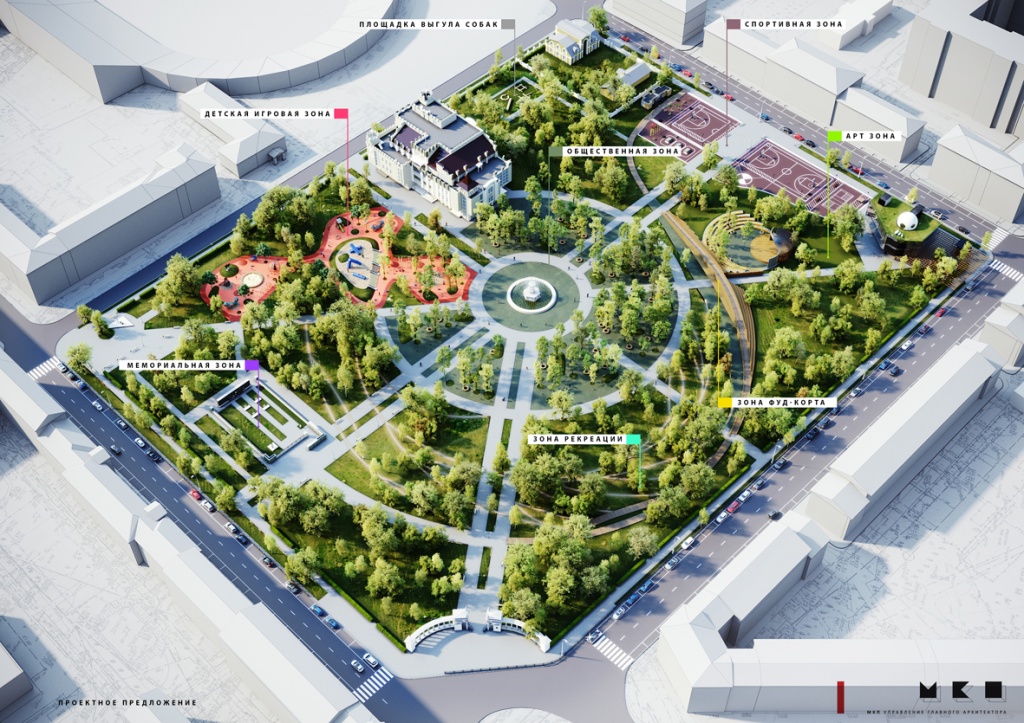 Проектом предусматривается создание целого ряда функциональных зон (мемориальной, рекреационной, спортивной, общественной, арт-площадки, фуд-корта, детской игровой территории, площадки для выгула собак.