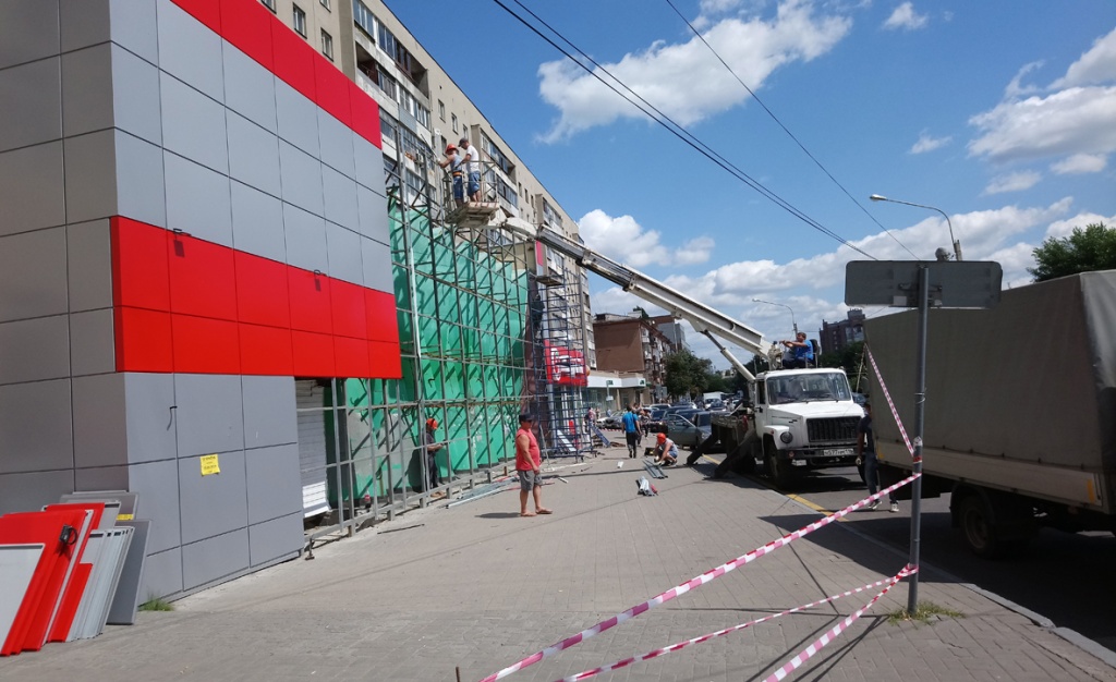 В Центральном районе приступили к демонтажу фасада торговой сети «Пятерочка»