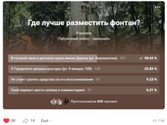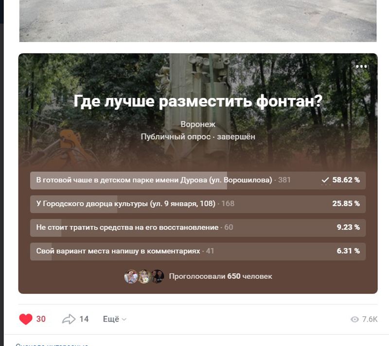 В течение недели пользователи соцсети решали, где фонтан найдет новое место – в имеющейся чаше в парке им. Дурова (на улице Ворошилова) или на территории у городского дворца культуры (на улице 9 января), также можно было предложить другое место или проголосовать за вариант «не стоит тратить средства на его восстановление».