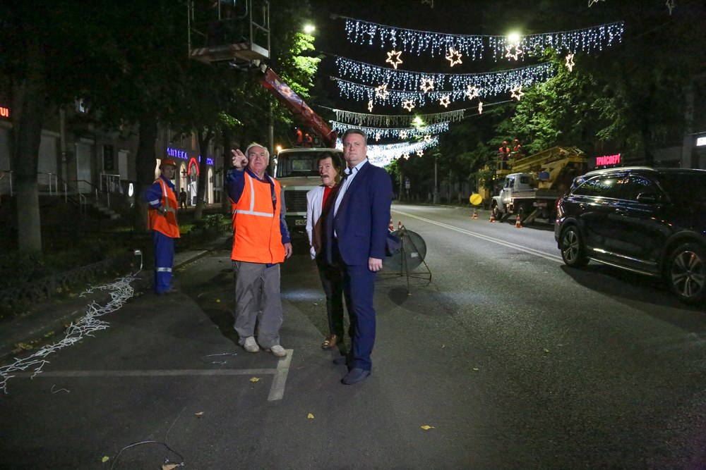 – Это далеко не все, что здесь будет. На каждом дереве мы разместим по 40 метров гирлянд с интересными подвесами и уже завершаем размещение конструкций на улице Мира, которые каскадом образуют звездное небо. Всего их будет размещено 68 штук на расстоянии 4 метров друг от друга, также мы выполнили ваше поручение и организовали подсветку памятника «Слава Советской науке», – доложил мэру Виктор Неугомонов.