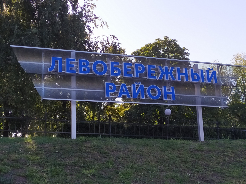Сделана она из металла, а внутри объемная надпись «Левобережный район». В вечернее и ночное время включается подсветка, и большие буквы видны с правого берега города.