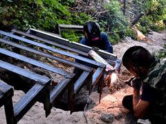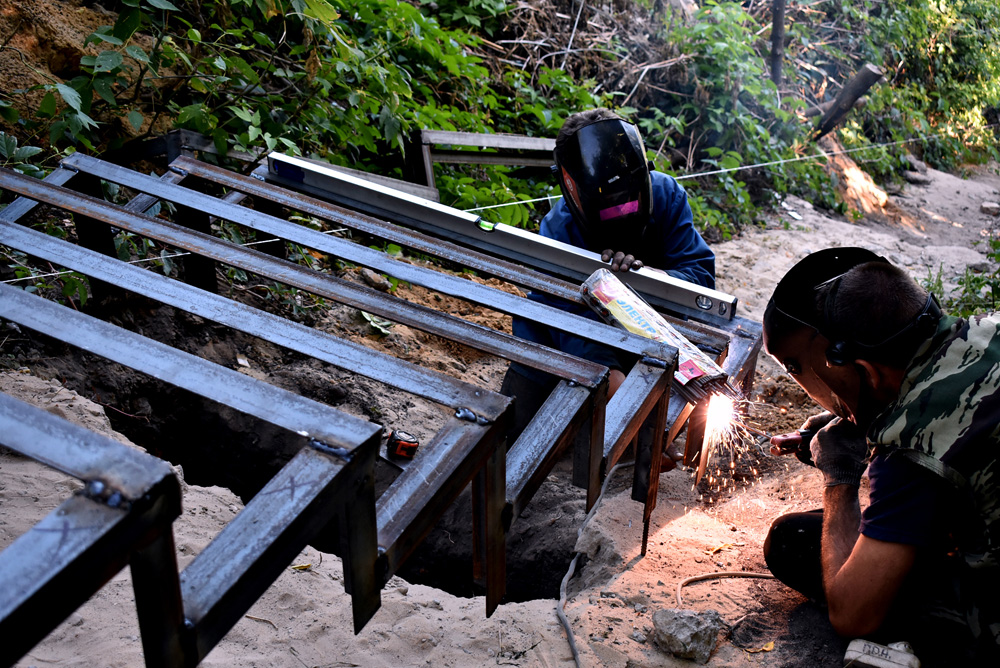 Сейчас на объекте завершены подготовительные работы: удалены старые лестничные марши, спланирован рельеф местности, рабочие монтируют каркас новой лестницы.