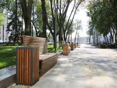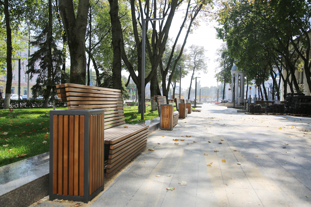 Скамейки в сквере имени Пушкина выполнены в минималистичном стиле с применением качественных сортов древесины. С учетом опыта других общественных пространств лавочки и банкетки сделаны не только удобными для отдыха, но и для их обслуживания сотрудниками комбинатов благоустройств.