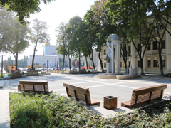 Завершаются работы по озеленению территории – в сквере высажены многолетние растения, организована и уже работает система автополива. На территории сквера нет открытого грунта, там произведены работы по мульчированию. Для обеспечения безопасности горожан установлено видеонаблюдение, подключенное к системе «Безопасный город». Есть и доступ к бесплатному Wi-Fi.