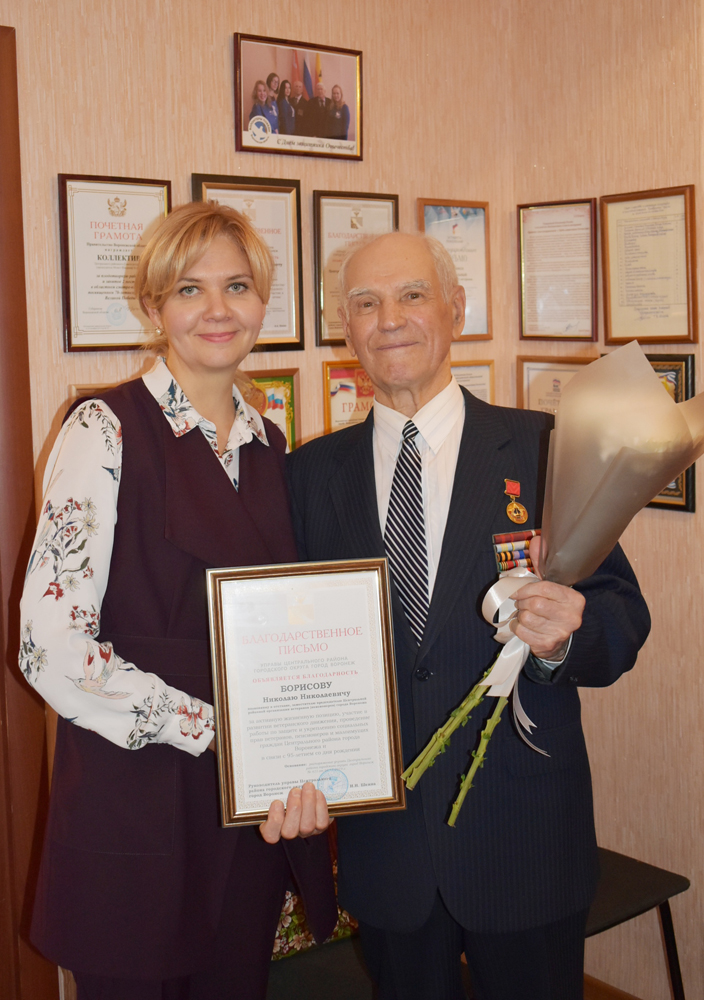 Николай Николаевич Борисов, несмотря на свой солидный возраст, по сей день активно участвует в общественной жизни города. Являясь заместителем председателя Совета ветеранов Центрального района и членом областного Совета ветеранов войны и труда, он решает многие общественные вопросы, чем завоевал авторитет и уважение среди ветеранов, пенсионеров и молодого поколения, с которым он проводит огромную работу по патриотическому воспитанию.