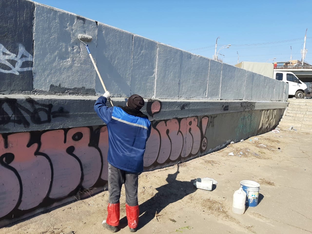 Сегодня ведутся работы по закрашиванию надписей, которые появились после прошедших выходных дней, пройдут на улице Карла Маркса и набережной Массалитинова.