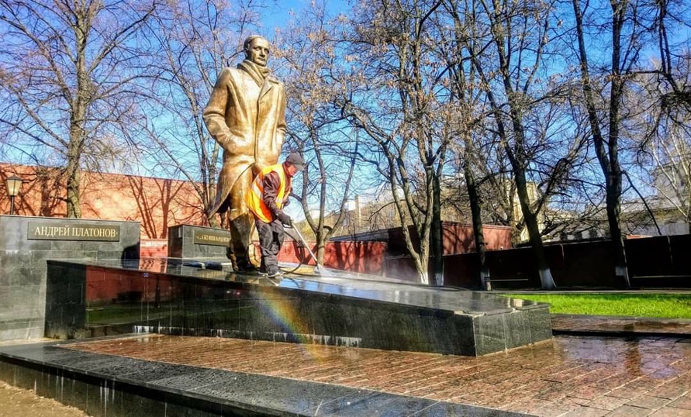 Сотрудники комбината провели очистку одного из монументов на территории района - памятника А. Платонову.
