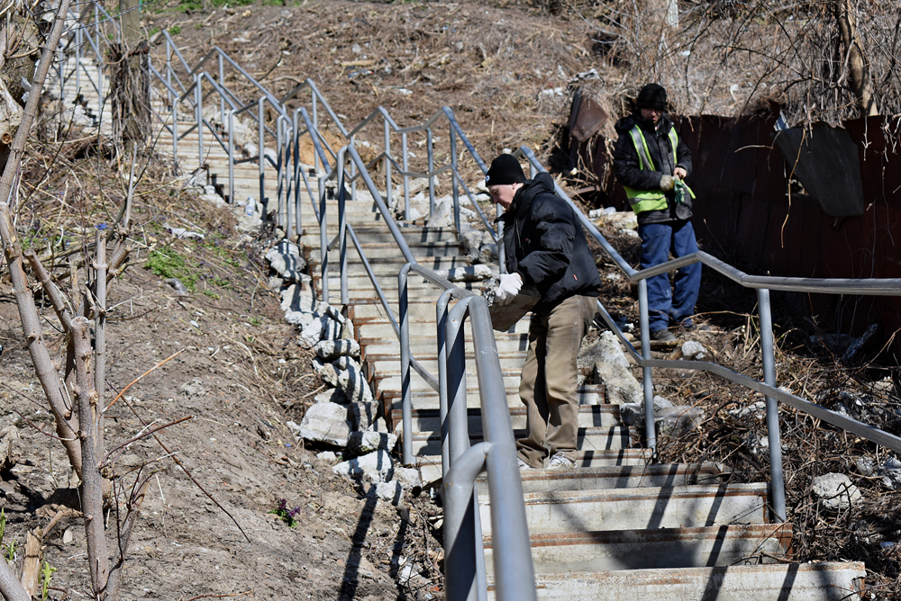 С наступлением весеннего периода сотрудники МБУ «Комбинат благоустройства Ленинского района» производят очистку нагорных лестниц от мусора, удаление поросли и сухостоя вокруг них.