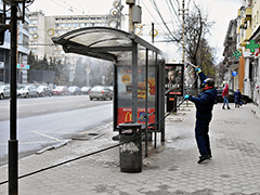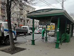 Сегодня работает три машины в Ленинском районе и две – в Центральном. Ими проводится дезинфекция всех остановочных павильонов, расположенных на территории районов, а также лавочек в общественных местах.