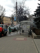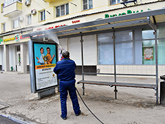 Сегодня работает три машины в Ленинском районе и две – в Центральном. Ими проводится дезинфекция всех остановочных павильонов, расположенных на территории районов, а также лавочек в общественных местах.