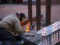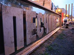 Металлический каркас высотой 96 см и длиной 5 м выполнен из черного металла. Сами же буквы, которые имеют высоту 56 см и вес около 20 кг – созданы с использованием лазерной резки из 12 мм стали. Надпись дистанцирована от фоновой пластины пятисантиметровыми нержавеющими втулками, что дает эффект «зависающих» в воздухе букв.