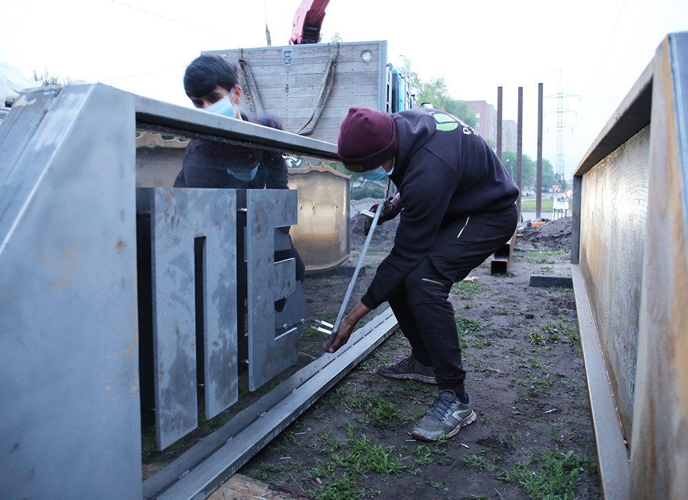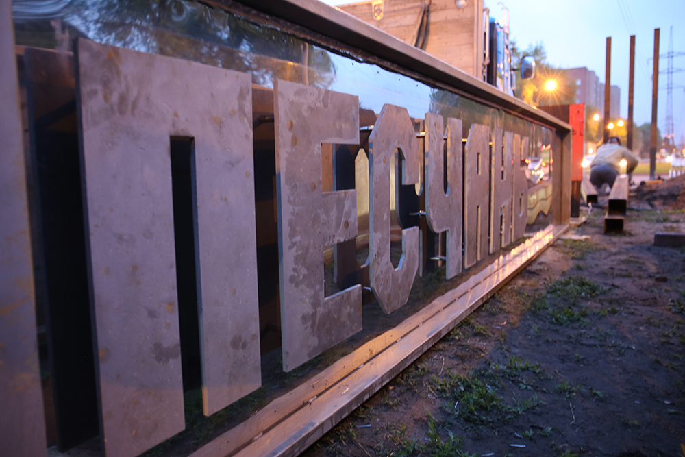 Металлический каркас высотой 96 см и длиной 5 м выполнен из черного металла. Сами же буквы, которые имеют высоту 56 см и вес около 20 кг – созданы с использованием лазерной резки из 12 мм стали. Надпись дистанцирована от фоновой пластины пятисантиметровыми нержавеющими втулками, что дает эффект «зависающих» в воздухе букв.