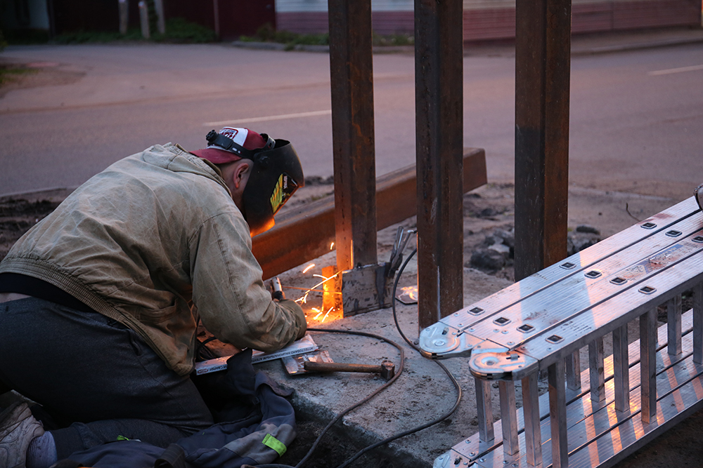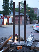Изменилась и высота конструкции – она достигает 4 метров. Надпись поднята от земли выше, чем была раньше: на отметке 2,5 метра – низ конструкции, верхняя точка будет на отметке 3,5 метра. Это сделано для того, чтобы указатель не мешал обзору водителей, которые выполняют разворот на ул. Матросова. Здесь часто двигаются грузовые автомобили, которые создают мощные потоки воздуха. Чтобы основание выдержало массу конструкции и потоки воздуха с учетом ее «парусности», был усилен свайный фундамент, который залит бетоном и уходит в землю почти на 2 м. Опоры, на которых закреплена стела – двойные. Внутренние имеют четырехкратный запас прочности. Внешние - не только усиливают конструкцию, но и визуально делают ее более мощной.
