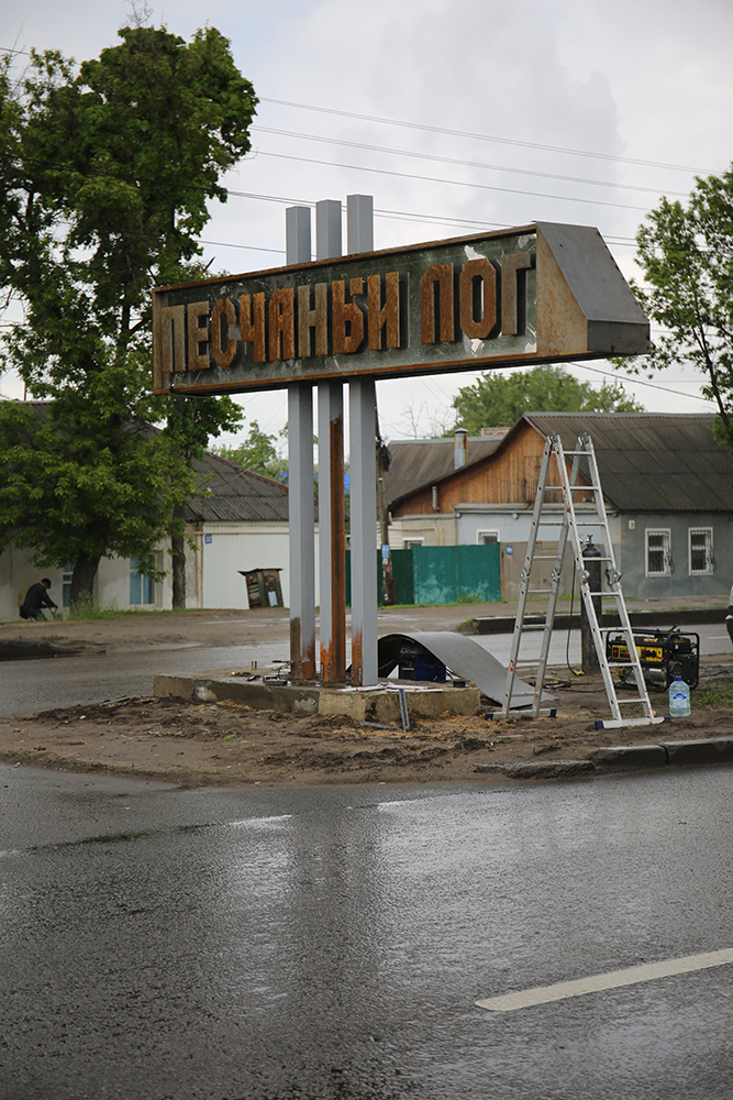– Указатель отпескоструен, чтобы и приблизить цвет букв к исходному, и создать эффект ржавчины, состарив композицию – как символ трагических событий, произошедших на Песчаном логу. А память и надежду символизирует задний фон, выполненный из нержавеющей пластины, в которой отражаются буквы надписи и мирное небо, – рассказал представитель подрядной организации Сергей Бакшутов.
