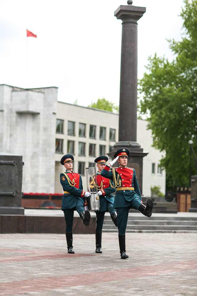 Началась церемония у братской могилы №6. Здесь у Вечного огня выстроился Почетный караул курсантов военно-воздушной академии. По команде «Внимание! К церемонии возвращения Вечного огня приступить!» один из курсантов зажег факел от пламени. Следом – огонь загорелся уже в специальной колбе, в которой воинская святыня будет со всеми почестями доставлена на площадь Победы.