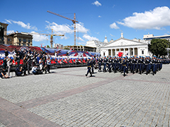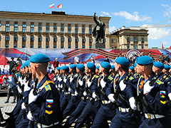 Ровно в 10 утра по московскому времени начался парад - на центральную площадь Воронежа знаменная группа, представленная ротой почетного караула Военно-воздушной академии, внесла государственный флаг Российской Федерации и Знамя Победы.
