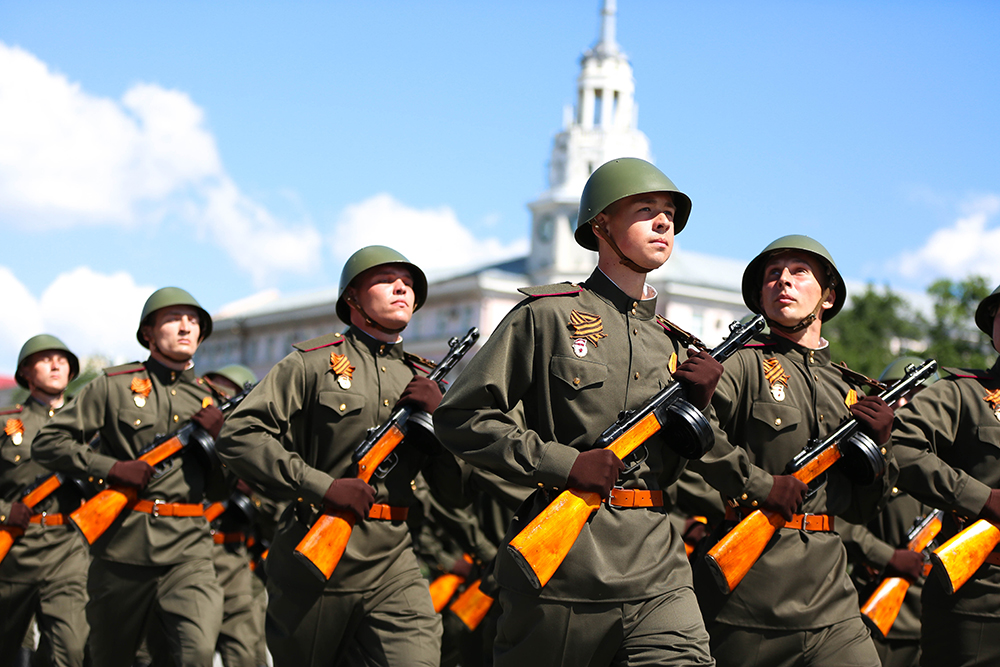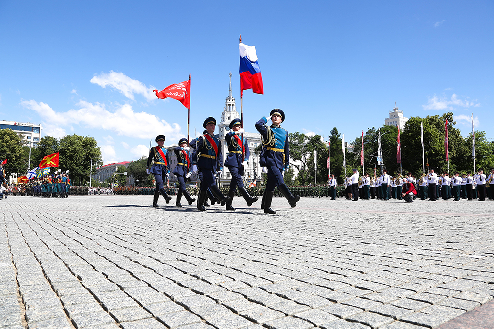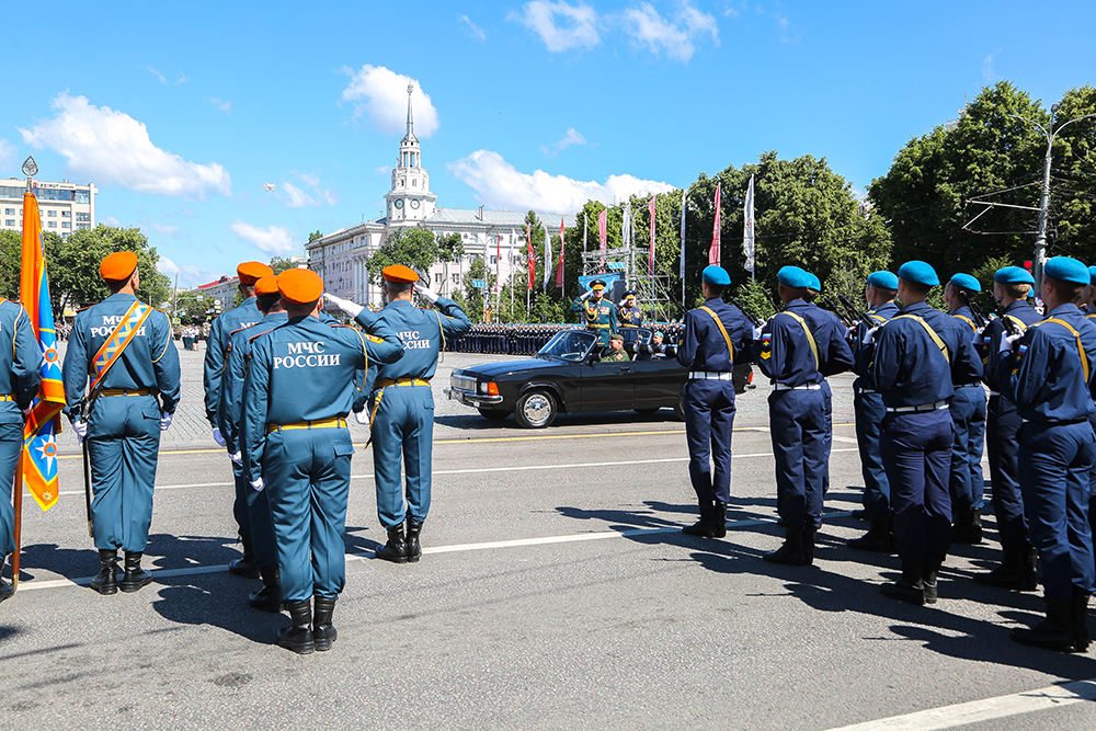 Ровно в 10 утра по московскому времени начался парад - на центральную площадь Воронежа знаменная группа, представленная ротой почетного караула Военно-воздушной академии, внесла государственный флаг Российской Федерации и Знамя Победы.