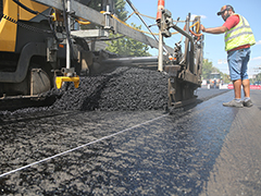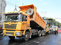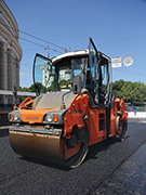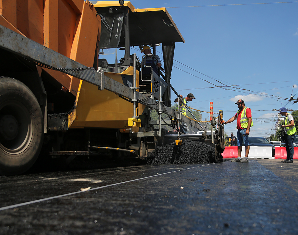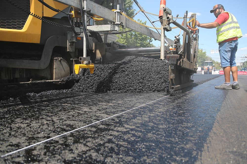 На укладке верхнего слоя покрытия из щебёночного-мастичного асфальтобетона было задействовано сразу два асфальтоукладчика и шесть катков. Был организован бесперебойный подвоз на место работ асфальтобетонной смеси специальными самосвалами (всего их потребовалось около 130).
