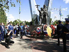 Присутствующие почтили память десантников, погибших при выполнении долга, возложив цветы и венки к мемориалу.