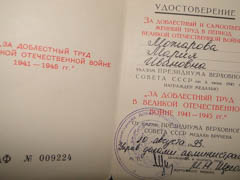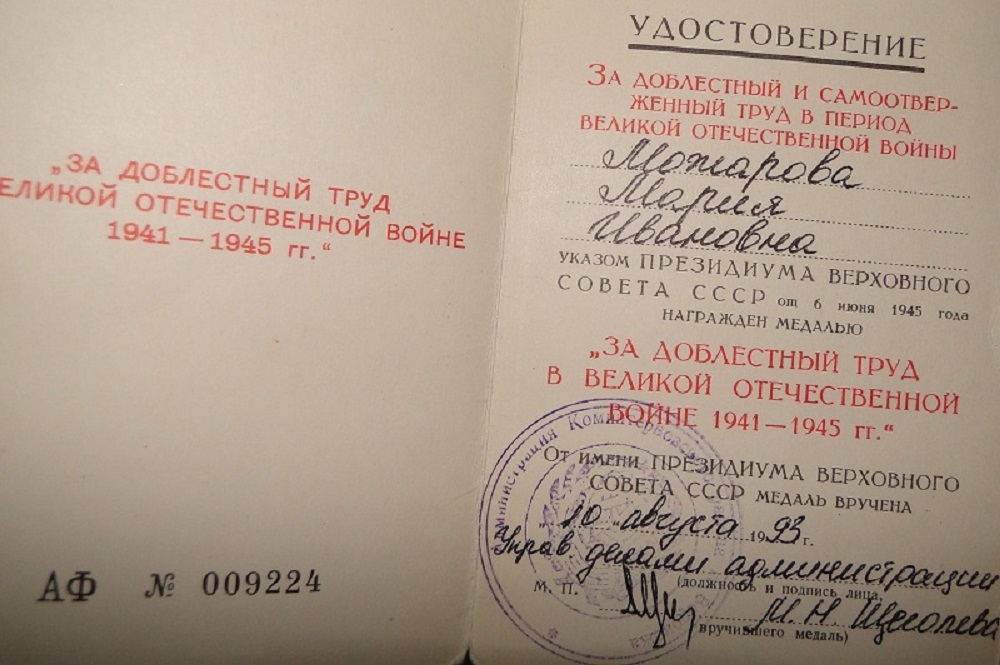 Мария Ивановна Можарова награждена правительственной медалью – «За доблестный труд в Великой Отечественной войне 1941-1945 гг.».