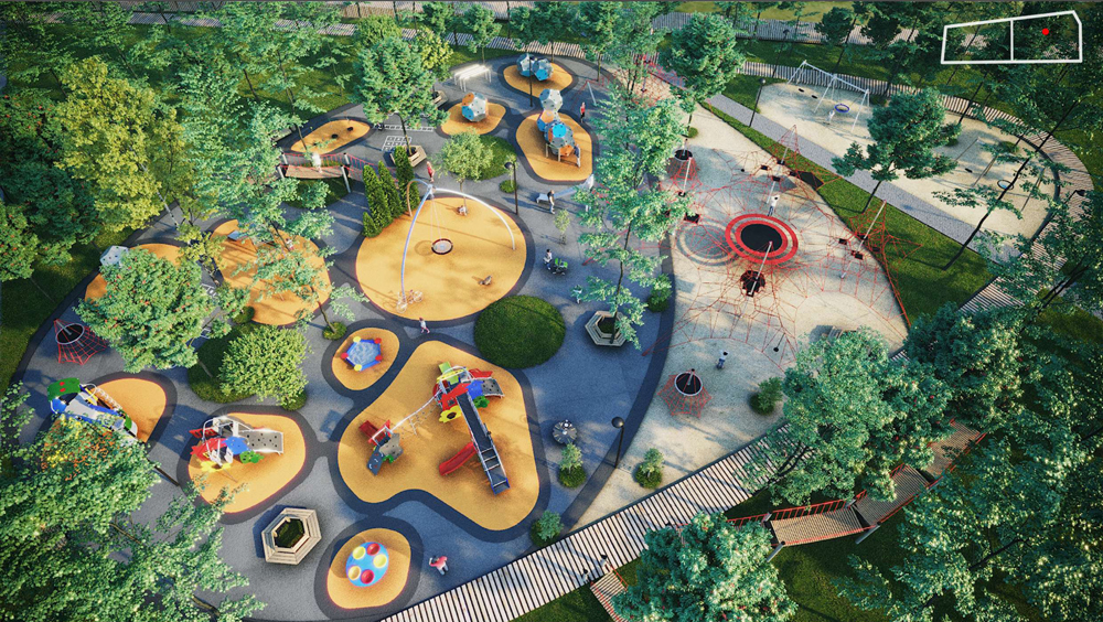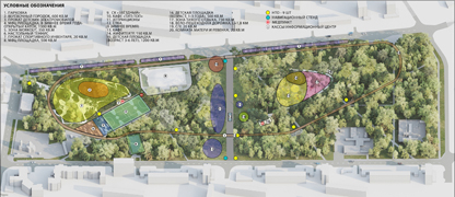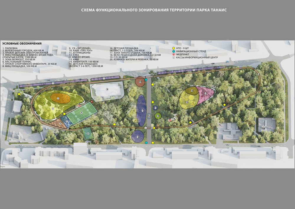 - - для обеспечения комфортного отдыха и пребывания разместить на территории парка: систему навигации, информационный центр (кассы), в спортивной зоне – медицинский пункт, прокат спортивного инвентаря, в детской зоне – комнату матери и ребенка, а также туалетные модули. На основных маршрутах парка предусмотрены точки общественного питания (кафе), современные МАФы (уличная мебель, урны, освещение), разные типы покрытия дорожно-тропиночной сети, велопарковки.