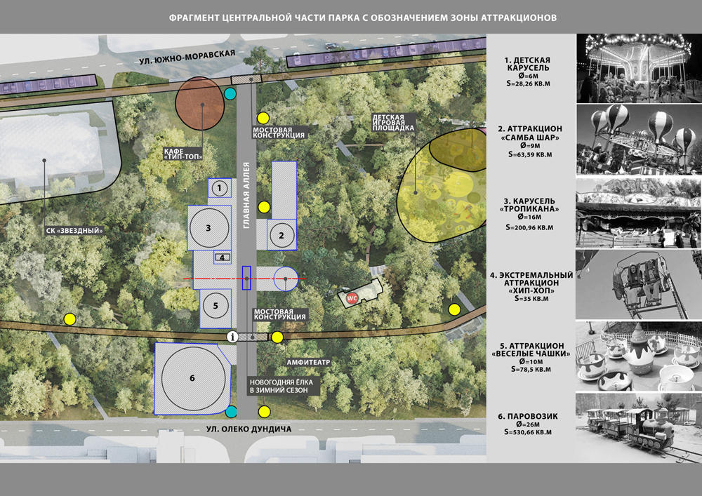 - - мост в центральной части парка может быть использован, как смотровая площадка, а площади под мостовым пространством – для организации информационного центра / пункта по продажам билетов на аттракционы, кафе, а также НТО, но возможно от этой сложной и достаточно дорогой конструкции можно будет отказаться.