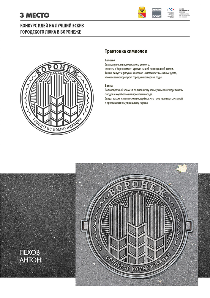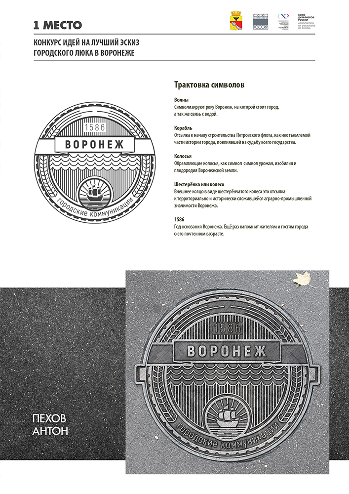 Первое место получил архитектор Антон Пехов. Его люк представляет собой симбиоз символов города. Так, волны – это связь Воронежа с водой, корабль – отсылка к нашей истории Петровских времен, год основания Воронежа тоже напоминает о его славной истории. Внешнее кольцо люка в виде шестеренки и колосьев – это символы исторически сложившейся значимости города, как аграрно-промышленного центра.