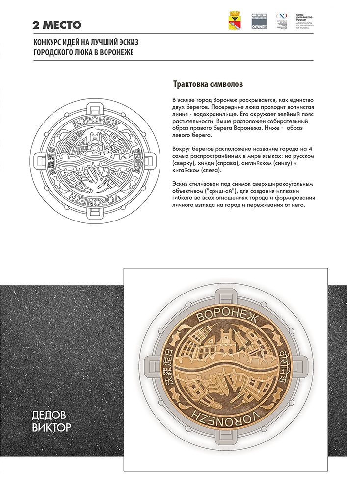 Второе место занял эскиз люка архитектора Виктора Дедова. По задумке автора Воронеж представлен в виде двух берегов. Линия в центре люка символизирует водохранилище, которое также делит город на два берега. Они, кстати, изображены в виде собирательного образа со стилизованными, но узнаваемыми зданиями и объектами. На люке представлено и название города на русском и еще трех распространенных в мире языках: хинди (справа), английском (внизу эскиза), китайском (слева). Кстати, сам эскиз стилизован под снимок сверширокоугольным обьективом (фиш-ай). Третье место получил еще один эскиз люка от Антона Пехова. В производство покапланируется запустить только первые два эскиза. Как ранее обещал глава Воронежа Вадим Кстенин, до начала реализации проекта итоги будут представлены горожанам. В течение недели можно высказать свое мнение по эскизам.